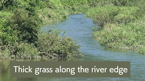 Stay away from areas with thick vegetation along the river, as they can block your view and hide dangerous spots. You might slip or accidentally fall into the water.