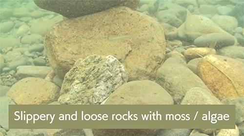 When water flows against large rocks or walls, it can create “undercuts”, hollow areas beneath the surface where the force of the water erodes the rock. Stay away from these dangerous spots, as they often have strong downward currents or swirling water that can trap branches, trash, or even fishing hooks.