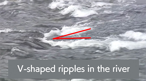 Avoid going near areas with V-shaped ripples in the river, as there might be concrete blocks or river piles beneath the surface.