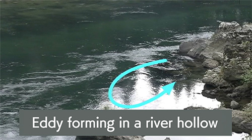 In places where water flows around rocks or into hollows, such as small pool-shaped areas created by river structures, eddies can form. An eddy flows in the opposite direction of the main current and moves more slowly. However, it eventually returns to the main flow. Always stay alert in these areas.
