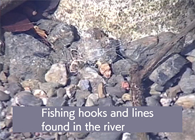 Fishing hooks and lines can be found anywhere in the river. If a hook gets caught in your skin, it can be painful and hard to remove. Fishing lines may also tangle around your body, making it hard to move underwater. Stay aware and be cautious.