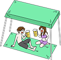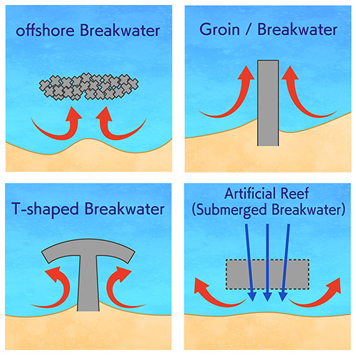 The edges of embankments are very dangerous as there is high risk of falling into the water. They can also become slippery due to waves splashing over them. When going near the water, wear non-slip sandals with heel straps or aqua shoes, and avoid leaning over the edge to look into the water. When the waves are high, do not approach the embankment.