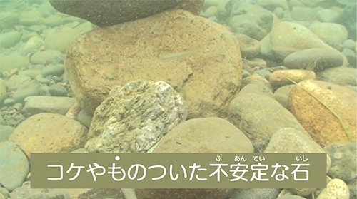川の中にある不安定なうき石に、うっかり足をのせるとバランスをくずして転倒し、流されることがあります。うき石の上に乗らないようにしましょう。