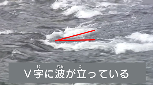 川の流れで、V字に波がたっているところでは、川の底にコンクリートブロックや、くいなどがある可能性があるのでさけて通りましょう。
