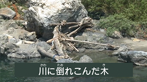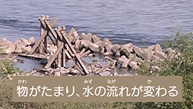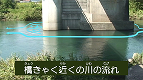 川には、川岸などのしん食を防ぐためのコンクリートブロックや川底のしん食を防ぐ“とこ止工”、橋を支える橋きゃくなどがあり、それらの物が川の流れや勢いを複雑に変える場所があります。こういった人工構造物に近づかないように注意しましょう。