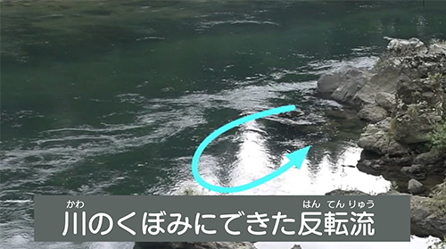 岩などがあり水が回り込んだ場所やくぼみのある場所<ワンド>などでは川の流れが反転する、反転流が発生することもあります。本流に比べて流れはゆっくりですが、その流れはいずれ本流にもどるので注意しましょう。