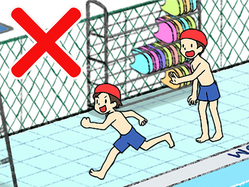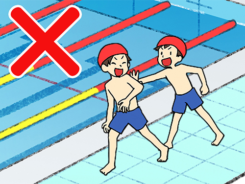 先せん生せいの話はなしはよく聞きいて行こう動どうしてほしいですが、プールサイドはぬれていて、すべりやすいので、ふざけたり走はしったりすることなく、必かならず歩あるきましょう。