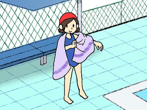 ③いつまでも体からだがぬれていると、体たい温おんがうばわれてしまいます。プールから上あがったあとは、体からだが冷ひえないよう、早はやめにタオルで体からだをふき、着きがえるなど、体からだを保ほ温おんしましょう。