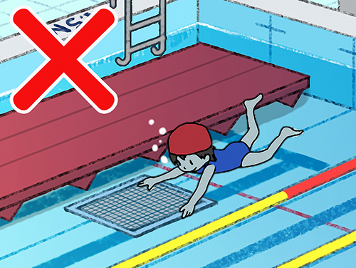 ⓷は万まんが一いち、すいこまれる危き険けんもあるので、はい水すい口こうに近ちかづいたりさわったりしてはいけません。自じ分ぶんがしないことはもちろん、友ともだちやバディにも注ちゅう意いしましょう。
