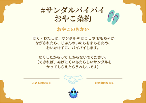 サンダルや遊あそび道どう具ぐが流ながされてしまった場ば合あい、「取とりに行いかなくては!」という気き持もちから、とっさに追おいかけてしまうことがあります。それは絶ぜっ対たいにダメです!追おいかけて取とりに行いってはいけません。その一いっ歩ぽが命いのちに関かかわる事じ故こにつながってしまいます。まずは、すべりにくいくつやサイズの合あったアクアシューズ、かかとのついたサンダルをはくことで、流ながされるのを防ふせぐことが重じゅう要ようです。サンダルバイバイおやこ条じょう約やくを読よんでみましょう!