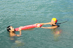 レスキューチューブはライフセーバーにとって最も身近な救助器材です。レスキューボードは一度に複数のおぼれている人を確保することできます。約10人がつかまっても、うくことが可能です。また意識のない人でもレスキューボードに乗せ、救助、運ぱんすることができます。