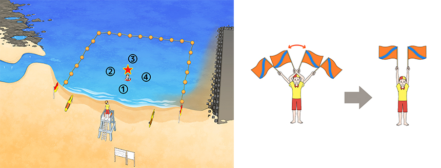 ライフセーバーは海上かいじょうパトロールや通信つうしん機器ききを使し用ようできないとき、かん視しとうや、浜はまにいるライフセーバーと「手て信号しんごう/シグナル」で連絡れんらくをとりあうことがあります。もし今いま、あなたがライフセーバーで、図ずの★の位置いちにいたとき、かん視しとうにいるライフセーバーから次つぎのようなシグナルを出だされたら、①~④のどこに移い動どうすればよいでしょう?