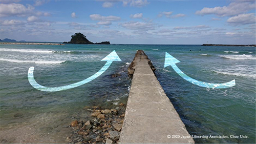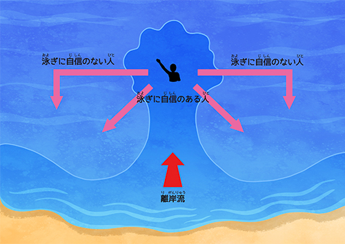 離岸流にはどのような危険があるのか? また危険を避けるために離岸流の見分け方や、離岸流に流されてしまったとしたら、どのような行動をとるべきかをみんなで考えてみましょう。