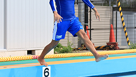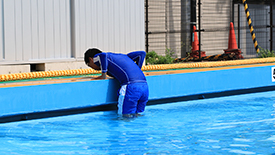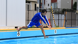 この動画は授業における児童、生徒に実施させることを推奨しているものではありません。先生方や指導者がプール内の異変等に気づいた際、安全かつ迅速に入水する方法の一つとして紹介しています。